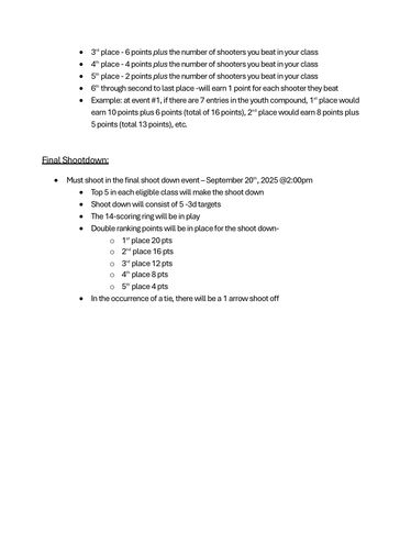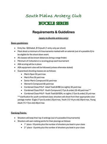 10,20,30,40,50 & 60 yards. This makes it suitable for archers of all skill levels. We follow ASA scoring and select classes from Jr. Eagle to Senior. If you are looking for a place to shoot your bow and meet some new friends come out and join us on one of our scheduled shoots or just give us a call or email.